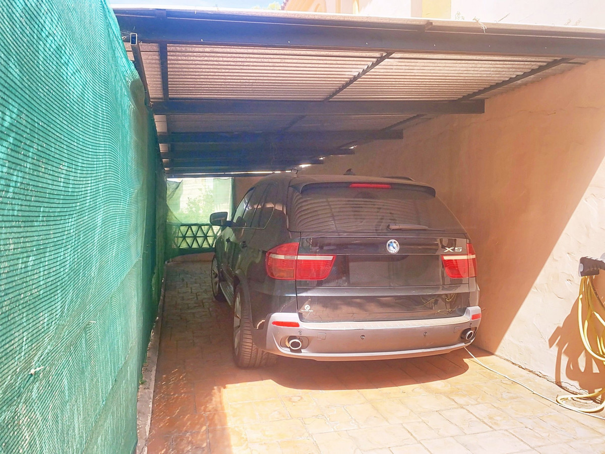 Le terrain privé dispose de deux patios. Le patio d'entrée comprend un porche et un abri voiture couvert pour deux véhicules, donnant accès à la maison. Au rez-de-chaussée, la propriété offre un spacieux salon-salle à manger avec cheminée et sols en marbre, créant une atmosphère élégante et chaleureuse. La cuisine, semi-ouverte et entièrement équipée pour un usage quotidien, communique avec la salle à manger et le patio d'entrée. Cet étage comprend également des toilettes invités pour plus de confort. Depuis le salon-salle à manger, on accède à une terrasse couverte de 40 m², idéale pour profiter du climat méditerranéen. Au rez-de-chaussée, la terrasse communique avec le patio avant, un espace verdoyant et ombragé qui, outre son accès latéral depuis la rue et son entrée indépendante à l'appartement d'amis, dispose d'un portail donnant directement sur la piscine commune.