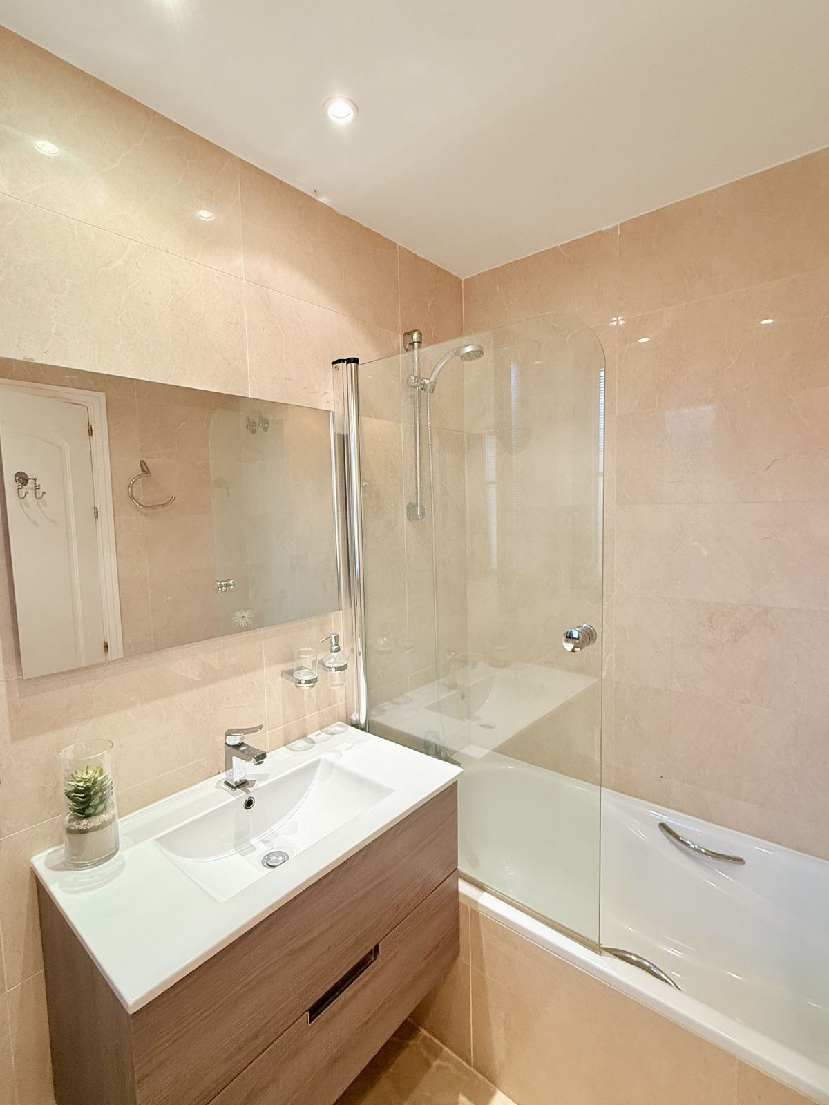 La propriété comprend deux chambres doubles spacieuses. La suite parentale dispose d'une salle de bain attenante avec baignoire et accès direct au jardin, tandis qu'une seconde salle de bain complète dessert la chambre supplémentaire et les invités. De vastes placards intégrés offrent un excellent espace de rangement.
