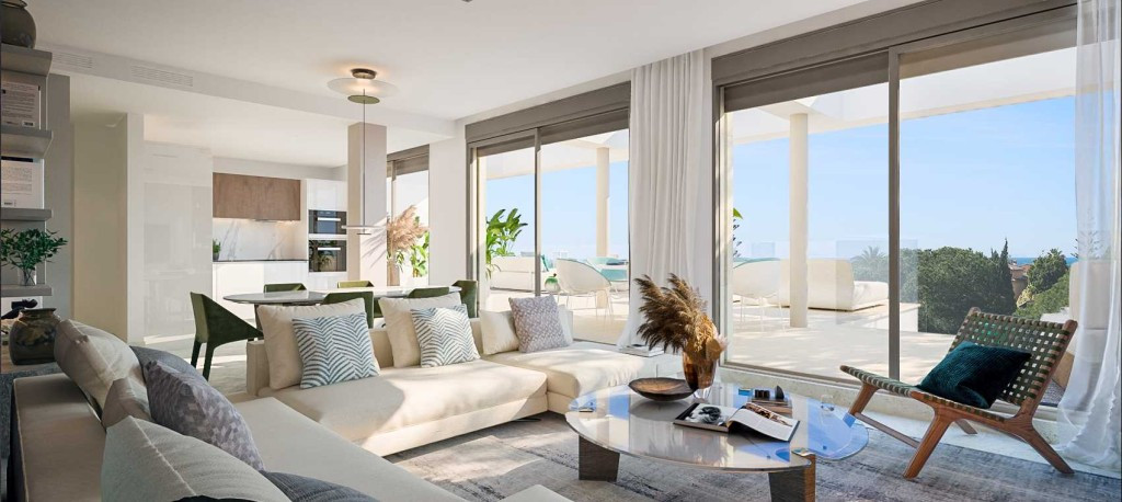 Elviria Beach Residences est un développement privé avec clôture périphérique, grands espaces verts, piscine commune, salle de sport et espace de coworking.