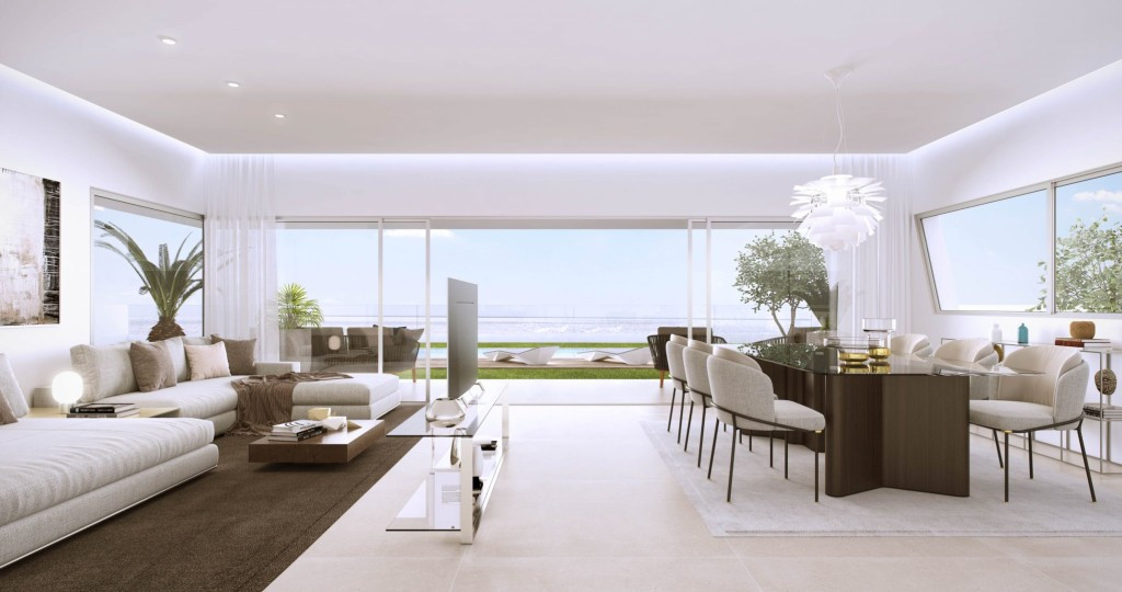 Ces propriétés de luxe offrent des espaces intérieurs bien répartis où le salon, la salle à manger et la cuisine entièrement équipée avec bar à déjeuner se fondent dans un espace de vie maximisant la vue grâce à de larges baies vitrées. La connexion entre l'espace extérieur et intérieur est fluide grâce à de généreuses terrasses couvertes et découvertes, idéales pour se détendre et profiter de la vue sur le golf et la côte sud-ouest jusqu'à la mer Méditerranée.