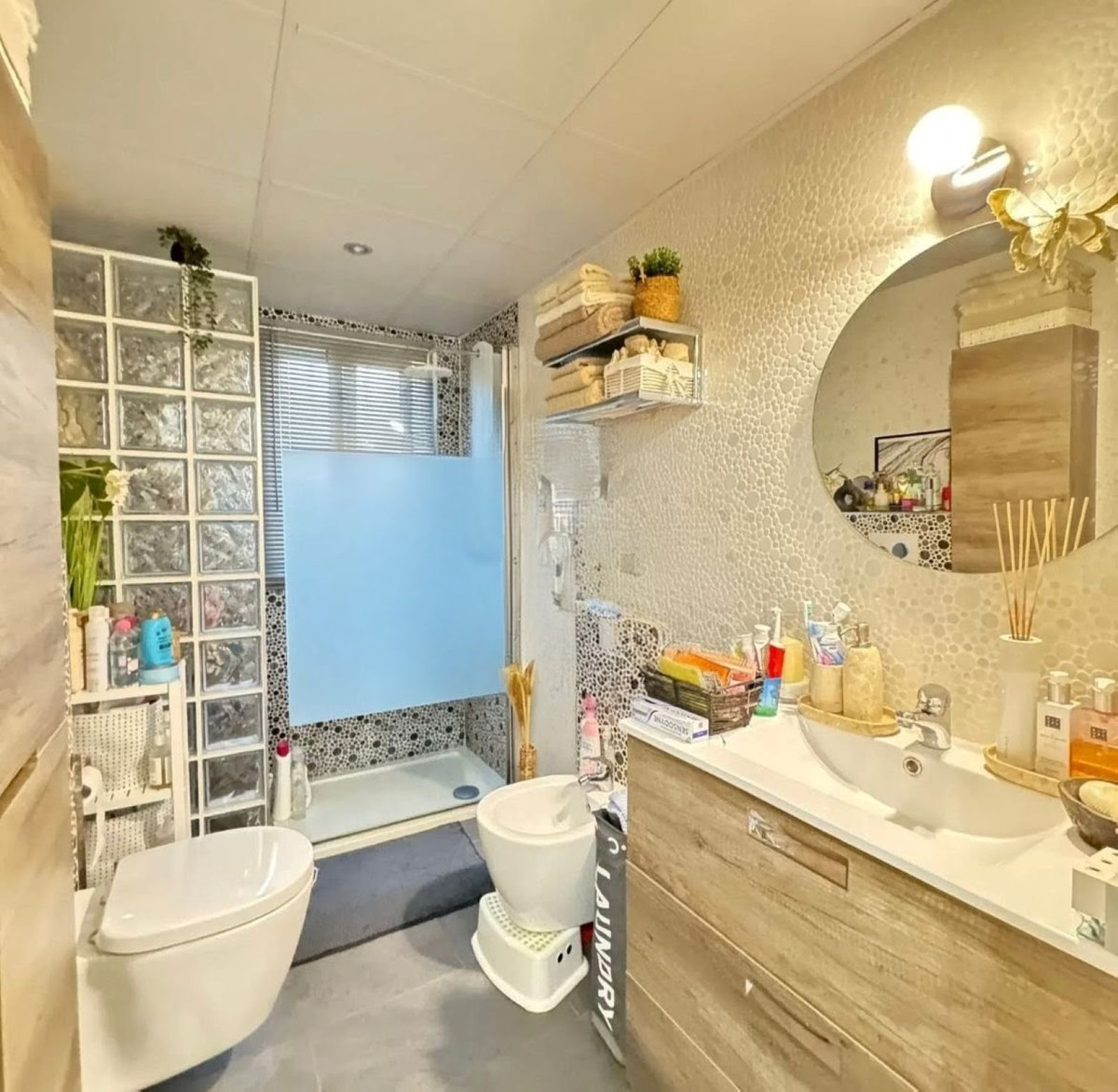 La chambre principale dispose d'un dressing sur mesure, tandis que la salle de bains, à la fois élégante et fonctionnelle, est revêtue de carrelage en porcelaine haut de gamme. La cuisine est équipée d'un plan de travail en marbre Silestone, idéal pour ceux qui apprécient à la fois le style et la praticité.