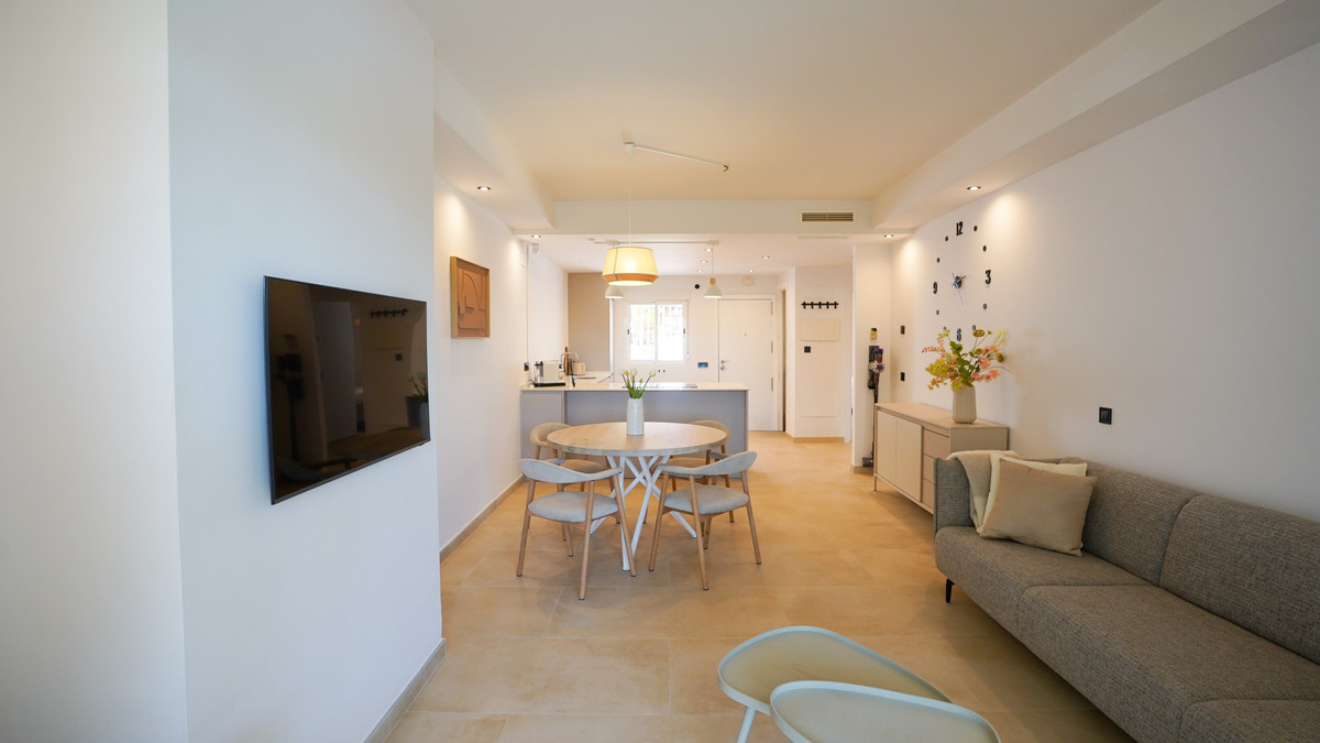 L'appartement dispose de deux chambres spacieuses et de deux salles de bains modernes et élégantes, toutes récemment rénovées selon les normes les plus élevées. Le salon et la salle à manger ouverts s'ouvrent sur une terrasse privée couverte avec vue paisible sur le jardin et la piscine, idéale pour dîner en plein air ou se détendre au soleil. Le double vitrage de haute qualité, la climatisation et un système d'alarme moderne assurent confort et sécurité tout au long de l'année, tandis que les placards intégrés offrent de nombreux rangements.