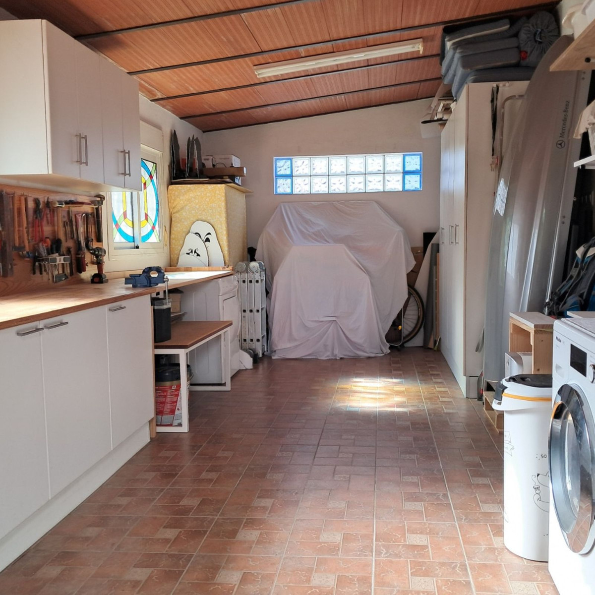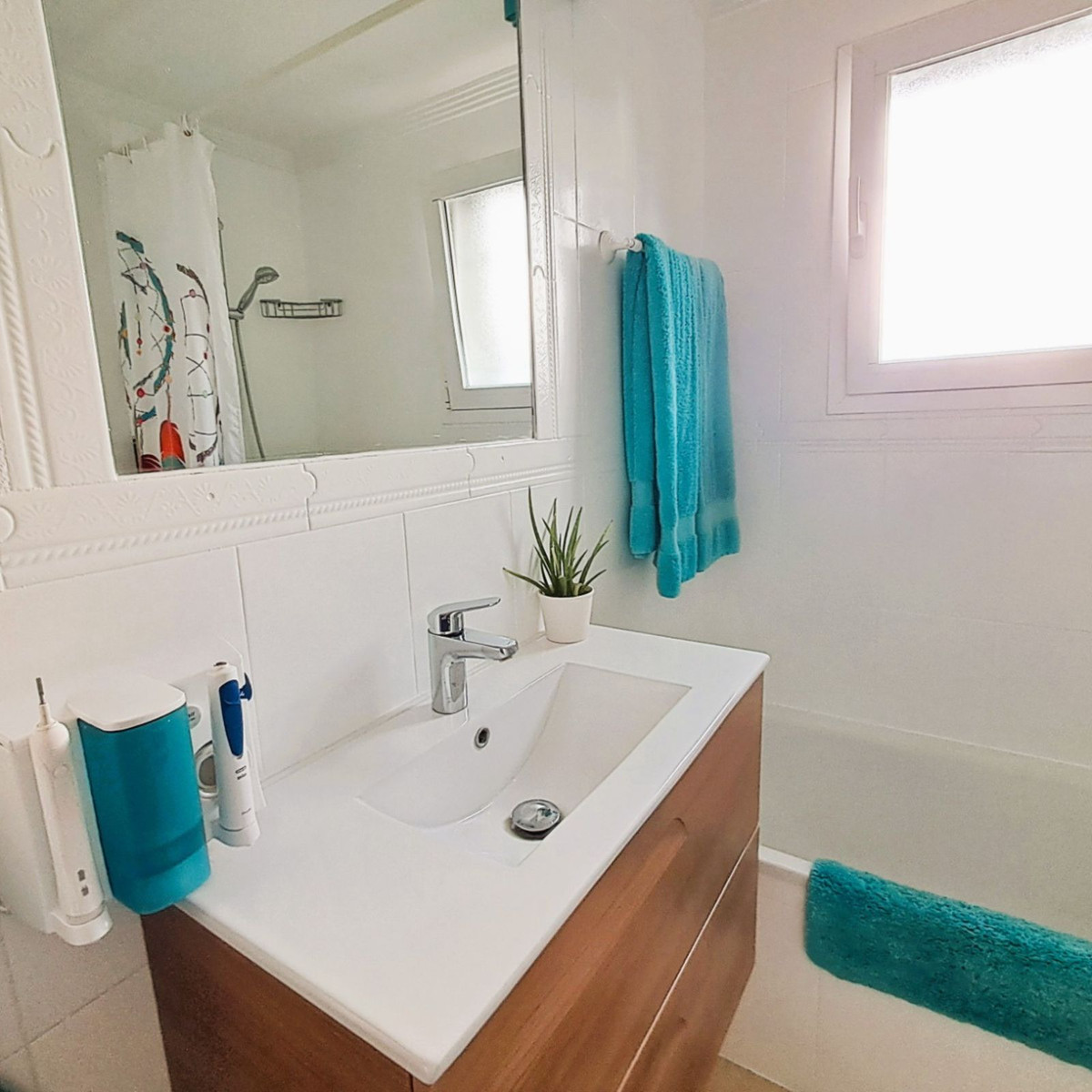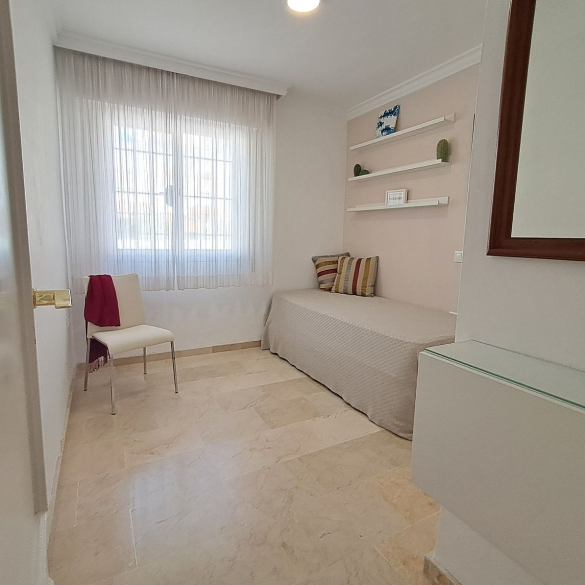 Au premier étage se trouvent trois chambres et deux salles de bains. La chambre principale dispose d'une salle de bains privative, tandis que la salle de bains familiale a été entièrement rénovée avec des matériaux haut de gamme. Le deuxième étage abrite une quatrième chambre spacieuse, actuellement aménagée en bureau, qui donne directement sur une terrasse de 18 m² sur le toit, entièrement rénovée en 2022, offrant une vue partielle sur la mer et même un aperçu de Gibraltar.