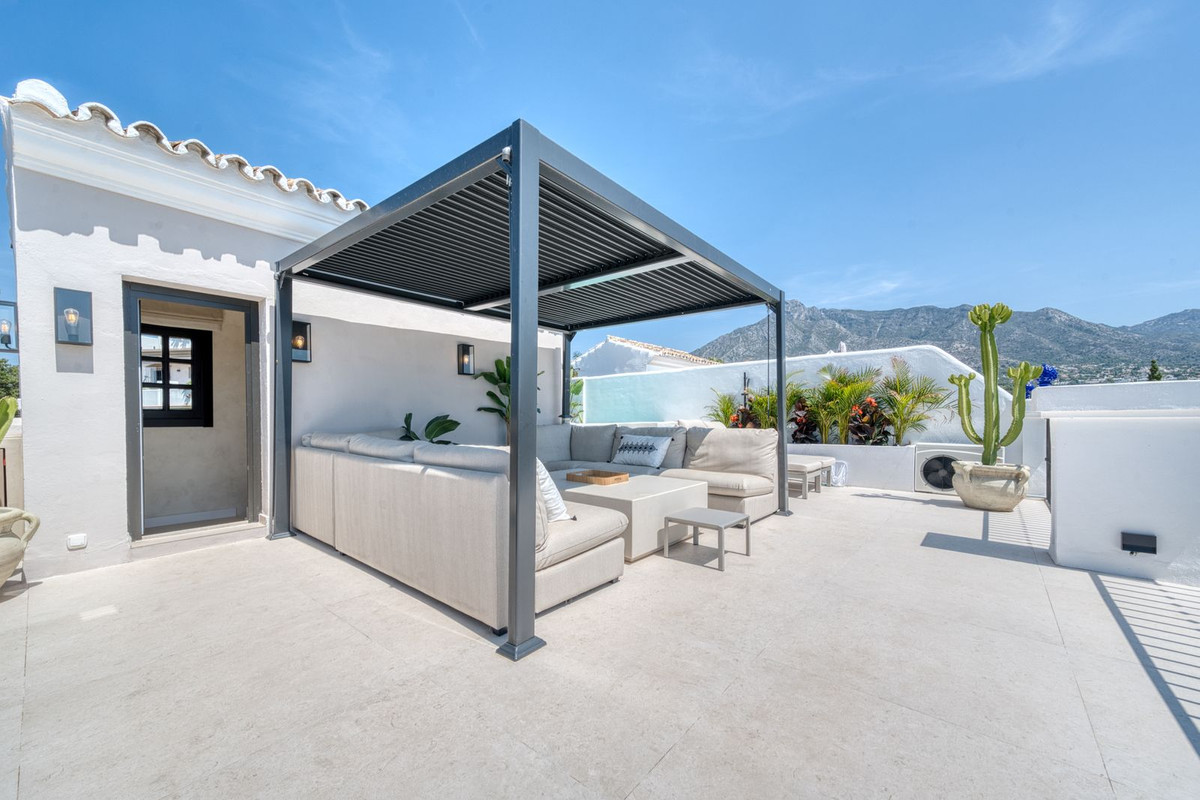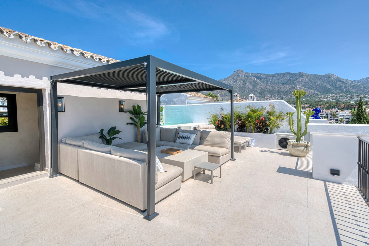 La terrasse sur le toit est tout simplement époustouflante, offrant une vue panoramique imprenable qui s'étend de La Concha aux toits du Puente Romano, en passant par la mer Méditerranée, et même Gibraltar et l'Afrique du Nord par temps clair. Conçue pour être habitée toute l'année, elle comprend un bassin chauffé, un espace barbecue et repas, ainsi qu'un salon ombragé pour se détendre, incarnant à merveille le style de vie marbellien, entre intérieur et extérieur. La propriété est proposée non meublée, mais le vendeur acceptera une offre incluant le mobilier dans la vente.