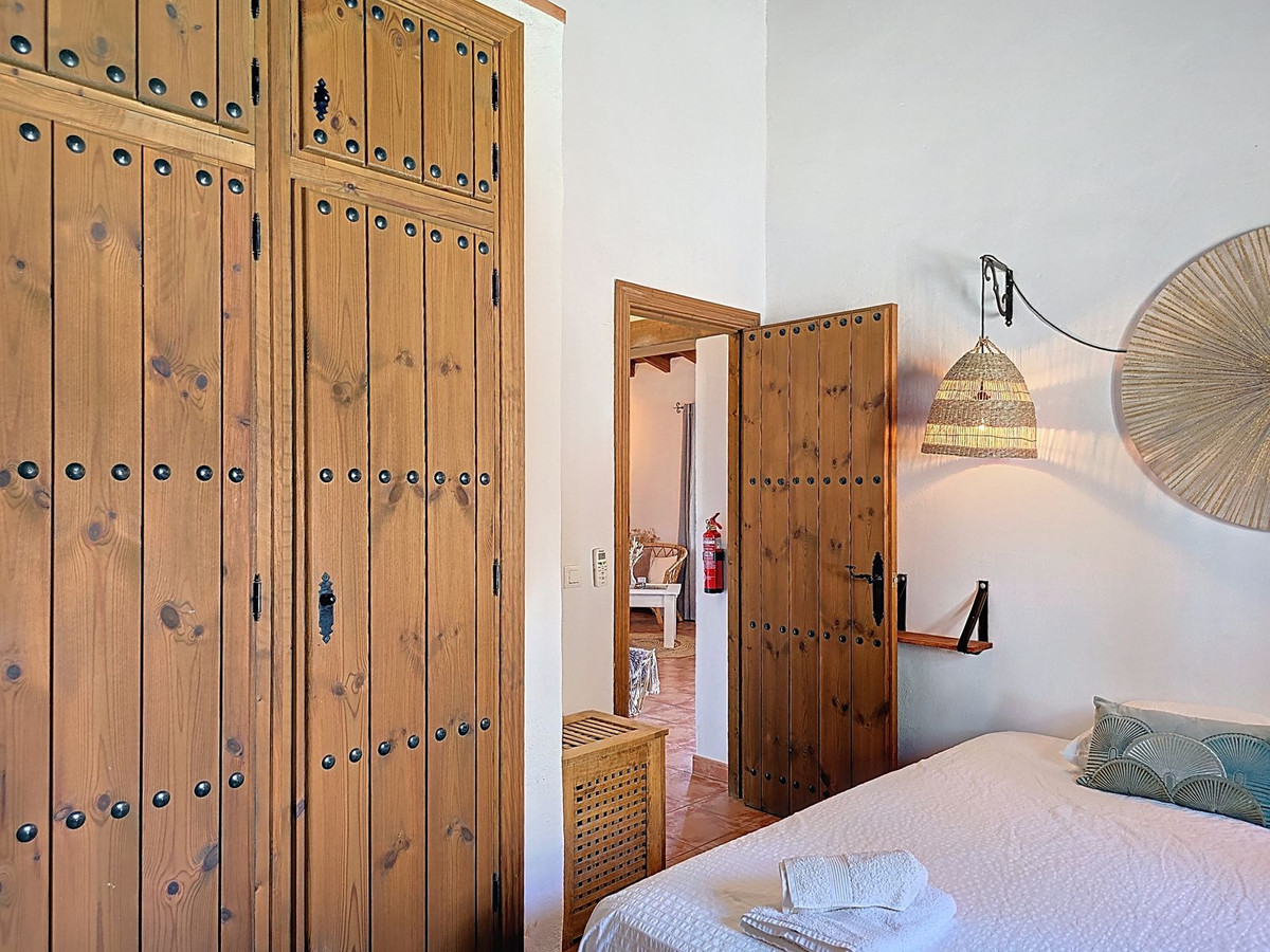 La propriété comprend trois chambres doubles spacieuses, chacune dotée de rangements intégrés et offrant une vue sur la campagne environnante. L'une des chambres bénéficie d'une salle de bains privative, pour plus d'intimité et de confort. Une seconde salle de bains familiale, ornée de carreaux andalous traditionnels et d'équipements modernes, offre un espace lumineux et fonctionnel, aussi bien pour les résidents que pour leurs invités.