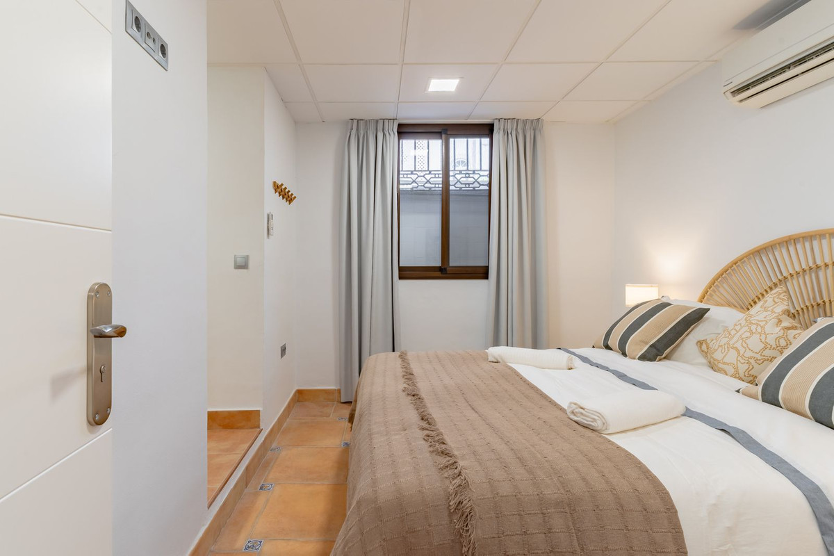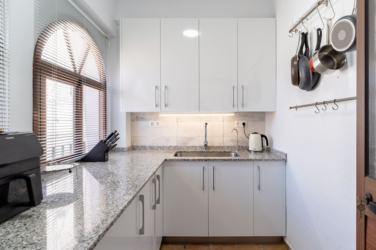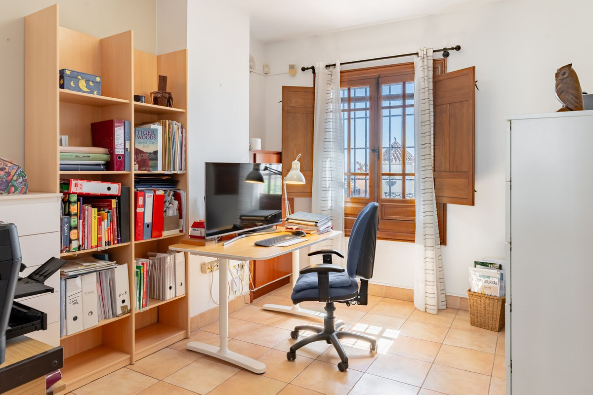 À l'intérieur, le rez-de-chaussée comprend un vaste séjour/salle à manger baigné de lumière naturelle, une cuisine entièrement équipée et trois chambres, dont deux avec salle de bains privative. Depuis le séjour, on accède à une superbe cour intérieure de style andalou, agrémentée d'une fontaine apaisante : un lieu idyllique pour se détendre.