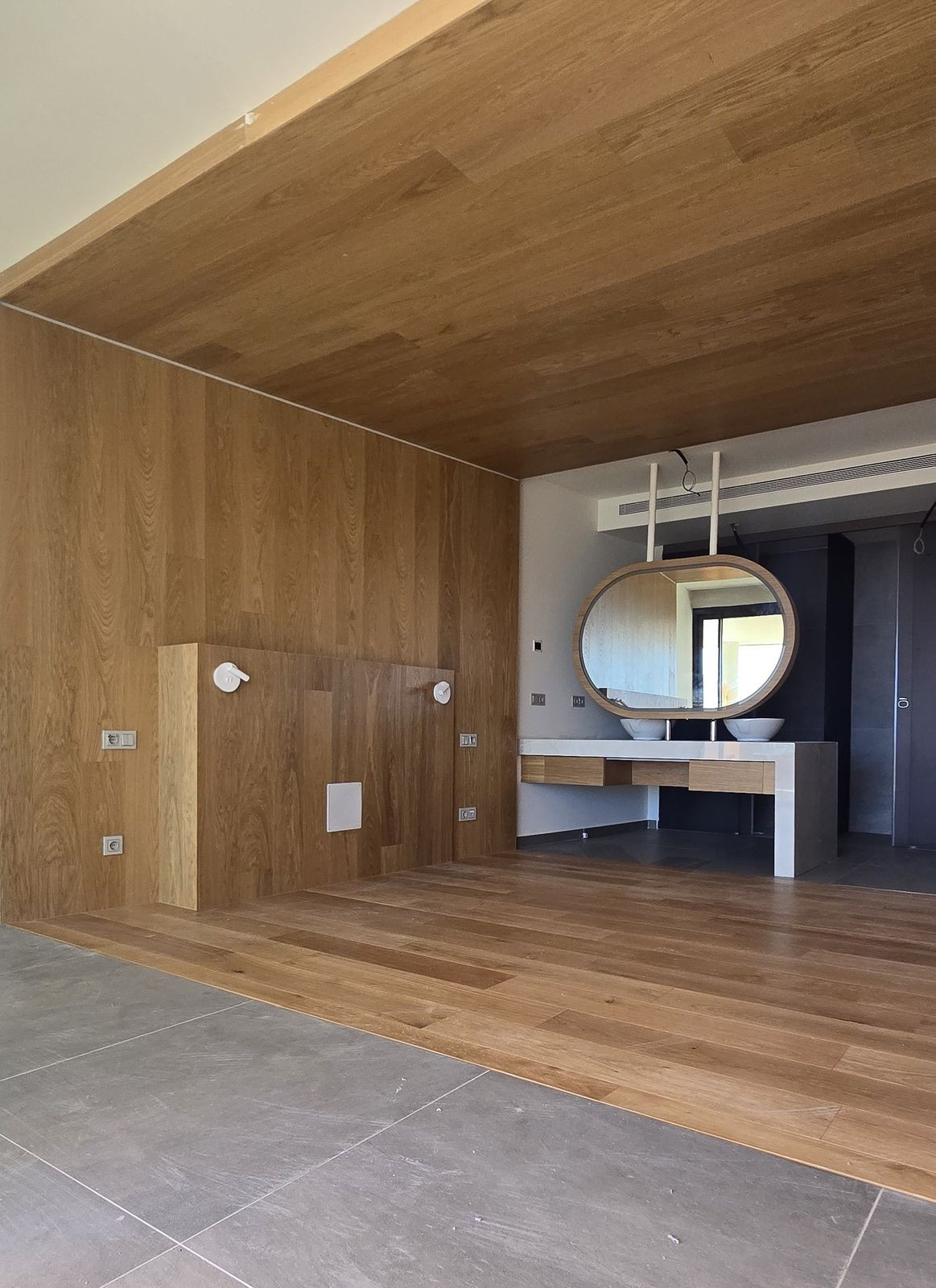 À L'INTÉRIEUR - un luxe discret : un espace ouvert et spacieux, des matériaux nobles, des lignes épurées ; des portes coulissantes en verre du sol au plafond qui prolongent harmonieusement votre espace de vie sur l'élégante terrasse. La terrasse se fond avec l'intérieur, offrant une expérience de vie en plein air.