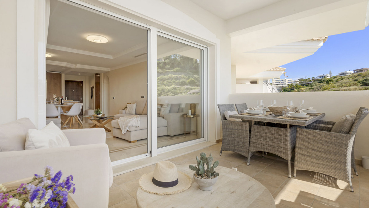 Nestled in the prestigious Aloha Hill Club, this stylish 2-bedroom, 2-bathroom home offers a built size of 124 m² plus 35 m² of terraces, designed to bring in light and capture sweeping sea views. Its southeast orientation ensures brilliant morning light and a warm, welcoming ambiance throughout the day.