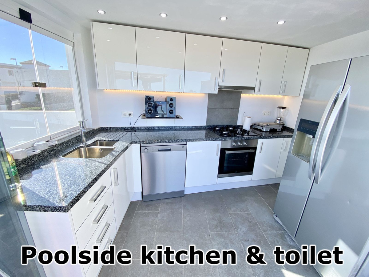 Cette superbe villa de 5 chambres et 5 salles de bains, à vendre à Benalmádena Pueblo, comprend également un studio indépendant, actuellement aménagé en appartement d'une chambre, et a été entièrement rénovée avec des prestations haut de gamme. La villa offre un vaste séjour/salle à manger avec moulures modernes, éclairage indirect et spots. Ce bel espace de vie bénéficie d'une abondante lumière naturelle grâce à trois grandes portes-fenêtres donnant sur la terrasse avec piscine. La cuisine américaine moderne, aux finitions blanches laquées, est équipée de nombreux rangements, du bas jusqu'aux meubles hauts, et intègre des appareils Bosch de luxe : deux fours, un micro-ondes et une machine à café. Le plan de travail et la crédence sont en granit foncé, avec un évier intégré, une grande plaque de cuisson à gaz Bosch et une hotte. Une fenêtre offre une vue sur la piscine et la mer. Un vestiaire avec WC et un escalier mènent au palier du premier étage.