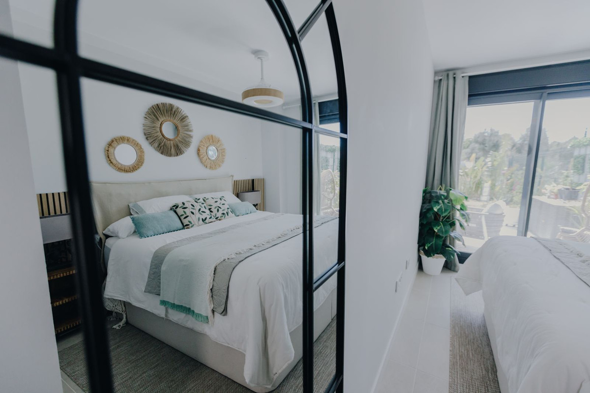 Appartement moderne de 2 chambres au rez-de-chaussée avec un magnifique jardin, situé dans la résidence de standing Aranya à Selwo, Estepona. Ce bien neuf, exposé plein sud et vendu entièrement meublé, offre des intérieurs lumineux et un design contemporain. L'espace de vie ouvert donne directement sur une spacieuse terrasse privative et un grand jardin, créant un cadre idéal pour les repas en plein air, la détente et les réceptions.
