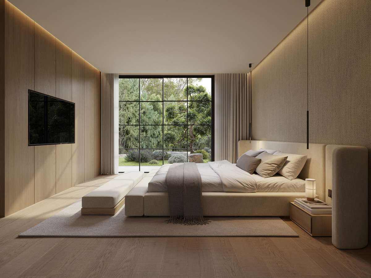 Le niveau principal est conçu avec soin pour séparer les espaces jour et nuit. L'espace nuit comprend une luxueuse suite parentale avec salle de bains et dressing, ainsi qu'un patio lumineux qui éclaire le couloir desservant trois chambres d'amis, chacune dotée de sa propre salle de bains. L'espace jour se compose d'un vaste séjour/salle à manger, d'une cuisine moderne, de toilettes invités et d'une buanderie. À l'extérieur, un porche-salon et une terrasse-salle à manger, complétés par des toilettes extérieures, une terrasse ouverte, une piscine avec solarium et deux jardins paysagers, offrent un cadre paisible idéal pour profiter du plein air.