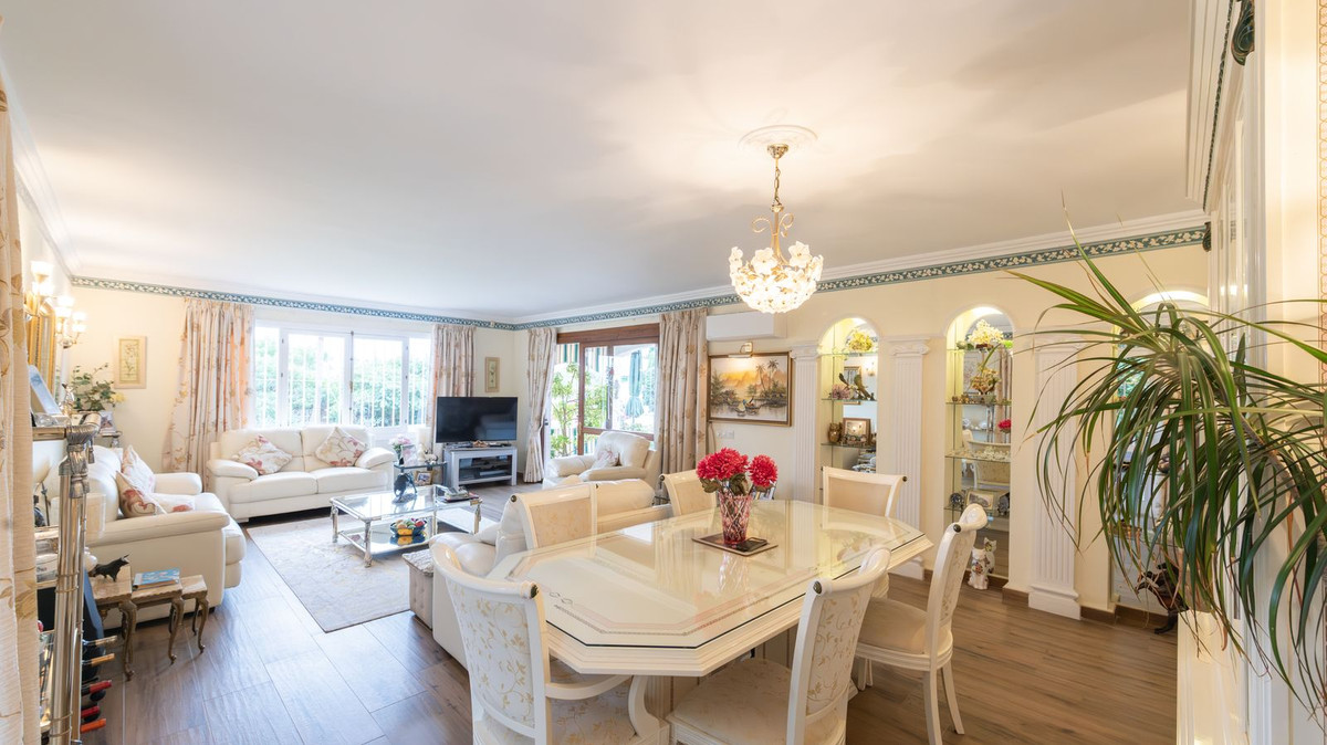 Le vaste séjour-salle à manger, avec ses larges fenêtres, s'ouvre sur une magnifique véranda couverte offrant une vue imprenable sur le jardin et la piscine, créant un espace idéal pour se détendre ou partager des moments en famille.