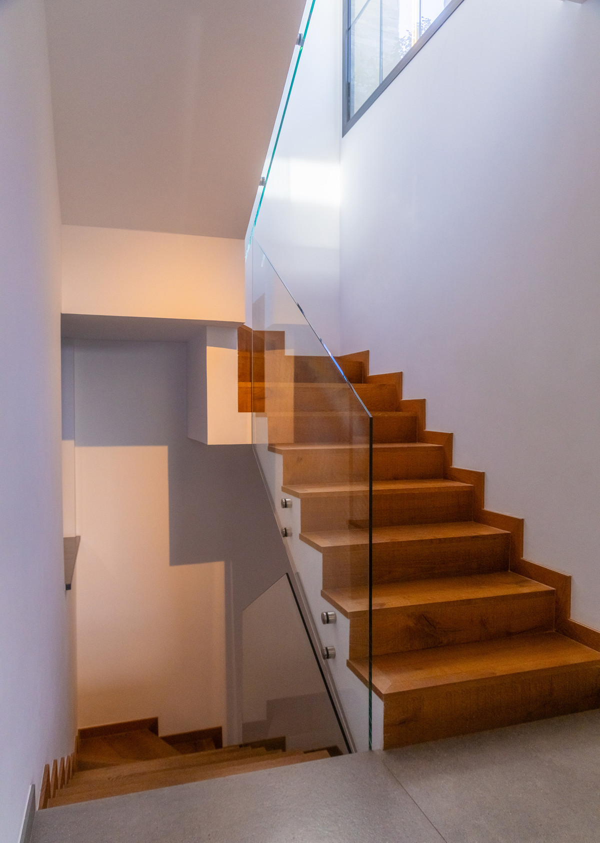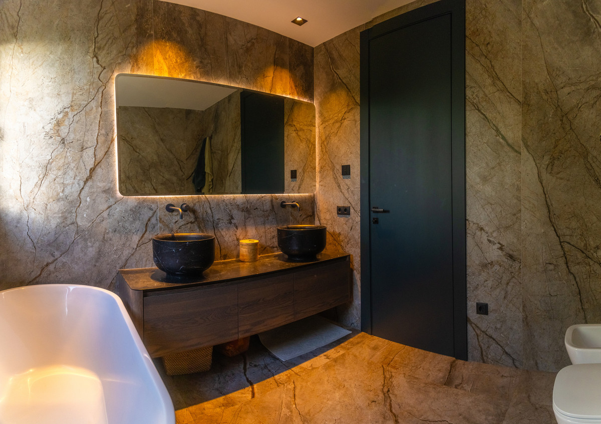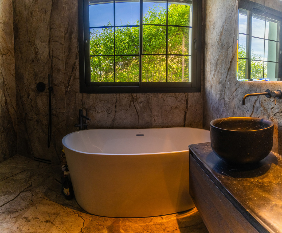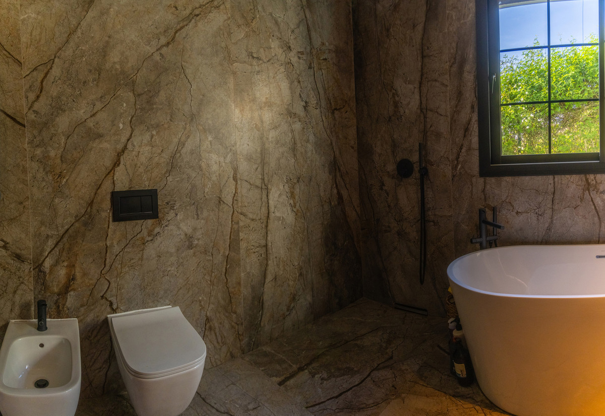 Cette villa bénéficie de finitions haut de gamme, notamment des éléments en pierre naturelle, un escalier Porcelanosa et un sol en céramique de qualité supérieure. Elle est équipée de fenêtres à double vitrage avec chambre à argon et vitrage Guardian Sun pour une isolation et une efficacité énergétique optimales.