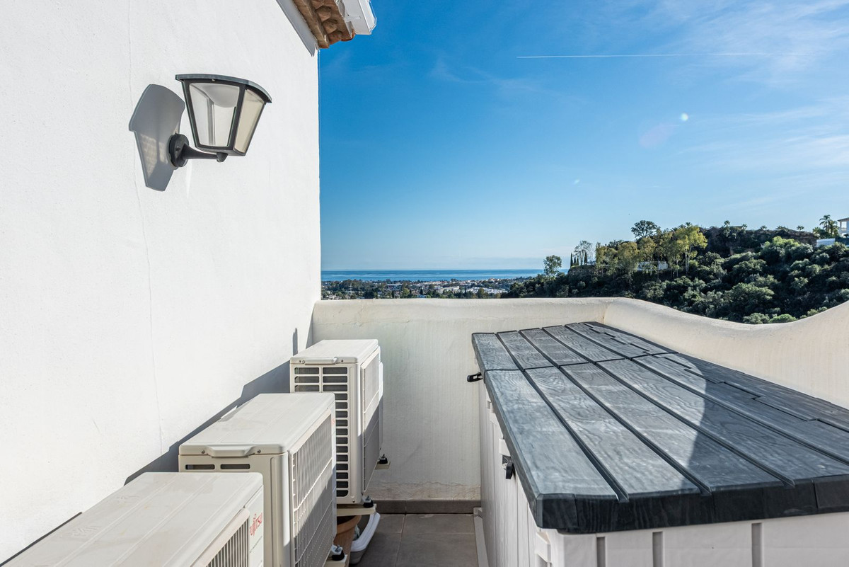 Penthouse rénové de deux chambres offrant une vue panoramique imprenable sur la mer à Las Terrazas de Los Almendros, Benahavís. Idéalement situé dans un cadre paisible à quelques minutes de San Pedro et de Puerto Banús, avec un accès facile aux commodités de Los Halcones.