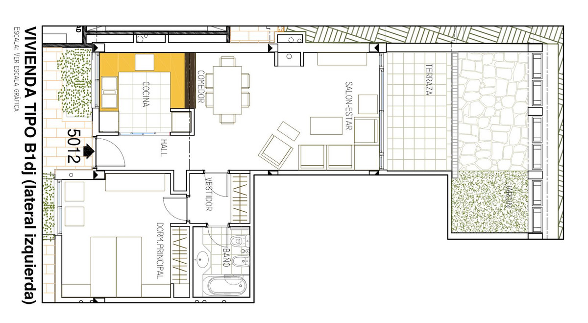 À l'extérieur, une terrasse partiellement couverte et partiellement découverte donne sur un petit espace gazonné privé offrant une vue agréable sur les jardins communautaires, idéal pour se détendre ou recevoir.