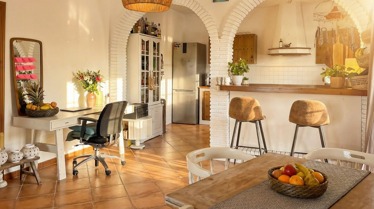 Inside, the villa exudes warm Andalusian charm, with terracotta floors and elegant arches, combined with an open layout that connects directly to the terrace and pool. The living area consists of an open kitchen with breakfast bar and a spacious, inviting living room.