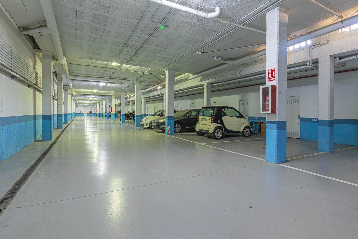 The townhouse includes two parking spaces. There is a covered parking space in the complex's garage and another outdoor space within the residential area.