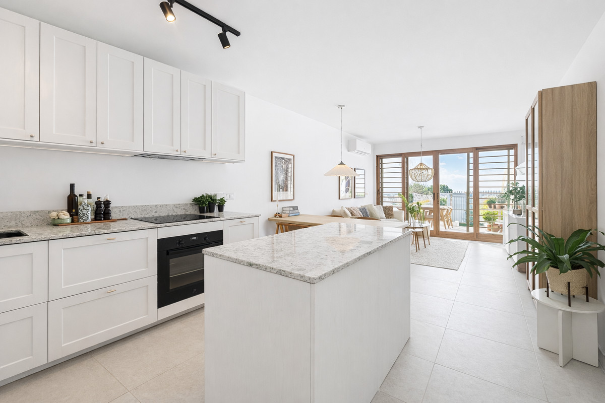 The property offers 3 bedrooms and 2 bathrooms, with a modern and functional layout. The kitchen flows seamlessly into the dining and living area, creating a bright, open-plan space that is both welcoming and perfect for everyday living or entertaining.