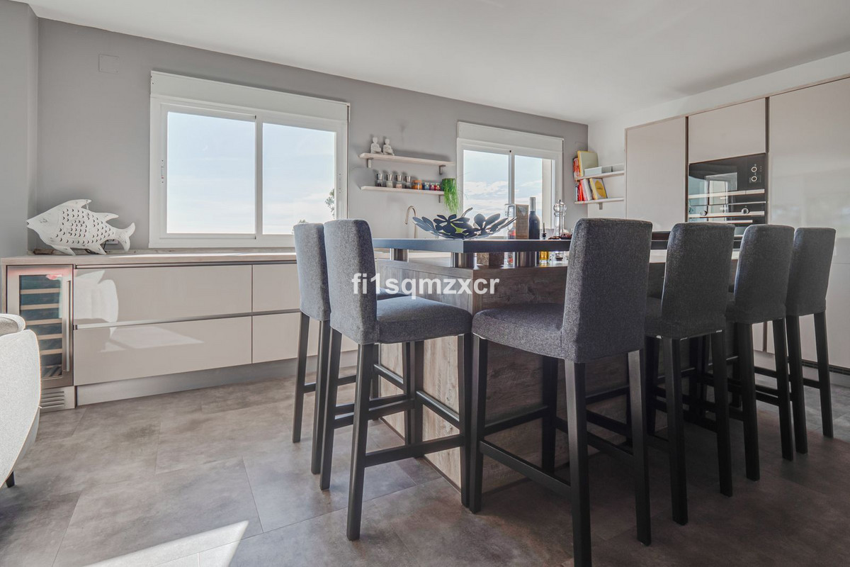 This unique corner penthouse with extraordinary views is located just a few minutes' walk from one of Marbella's most beautiful beaches, home to the best beach clubs, chiringuitos, and beach restaurants. The property has been completely redesigned and modernized with the finest materials. From the entire property, you have spectacular views of the entire coastline, Africa, and the mountains. Fourth floor: Hallway/entrance with stairs to the upper floor, guest toilet, new modern kitchen with a bar and high-quality appliances, a TV corner with a wood-burning stove for romantic evenings, a large L-shaped dining area with panoramic views, a bedroom, and a spacious bathroom.