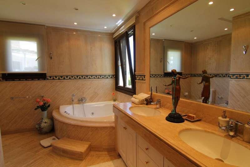 Exquisite lounge/dining area with open fire place feature, leading out to a superb sun terrace with sea and mountain views. Separate office /study off the dining area. Superb large terrace for dining "al fresco" or relaxing taking the sun. Awnings, mosquito screens and ceiling fans facilities. Beautiful fully equipped kitchen with top appliances, American fridge freezer and granite work tops. Separate utility area with washing machine and dryer.
