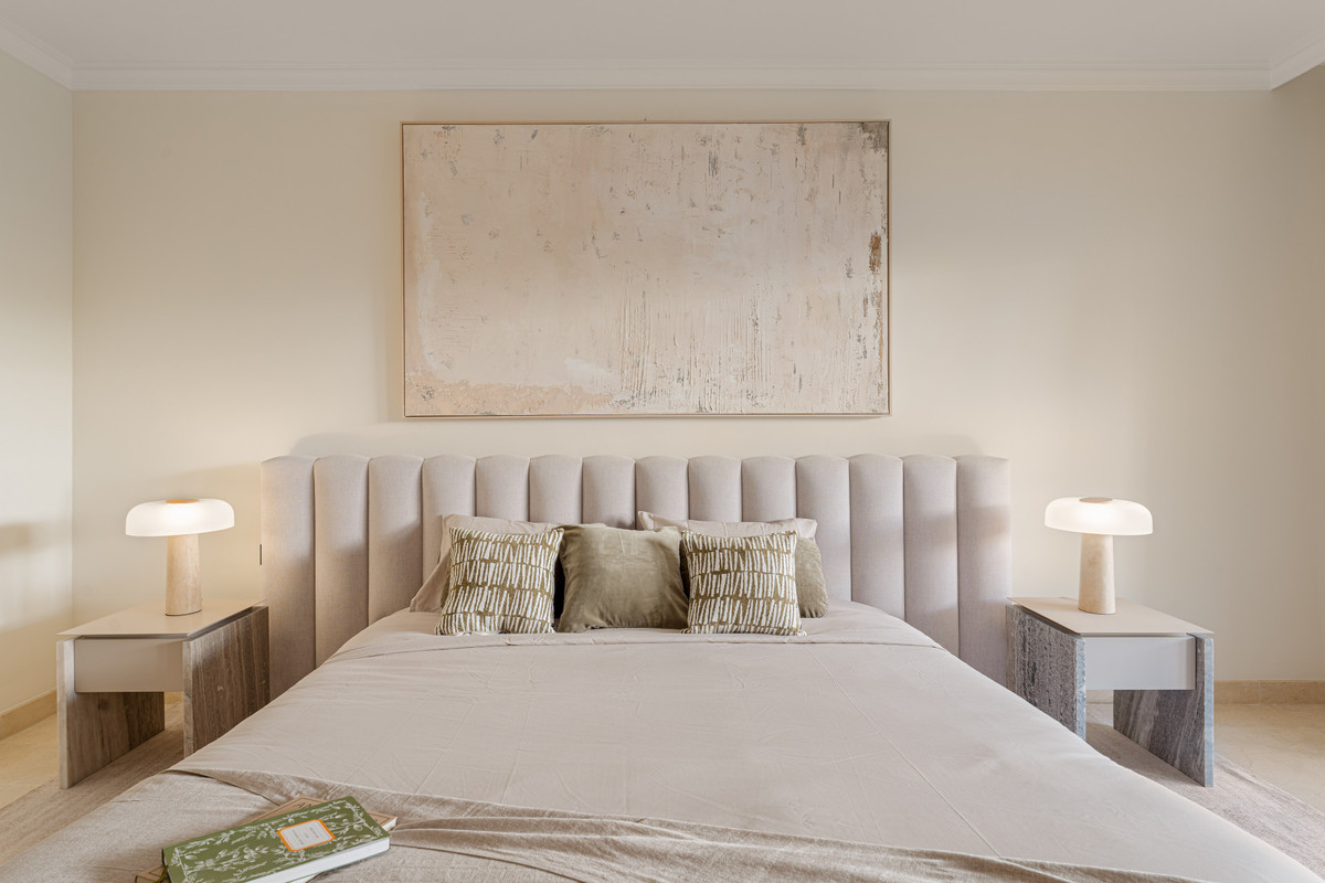 The property features three bedrooms, two of them en-suite, and a third bathroom located next to the third bedroom, which serves both privately and for the rest of the apartment. The master bedroom stands out for its generous size, walk-in closet, and direct access to the terrace. The remaining bedrooms maintain the same level of quality, with built-in wardrobes, abundant natural light, and a sense of privacy that makes them suitable for family members or guests.