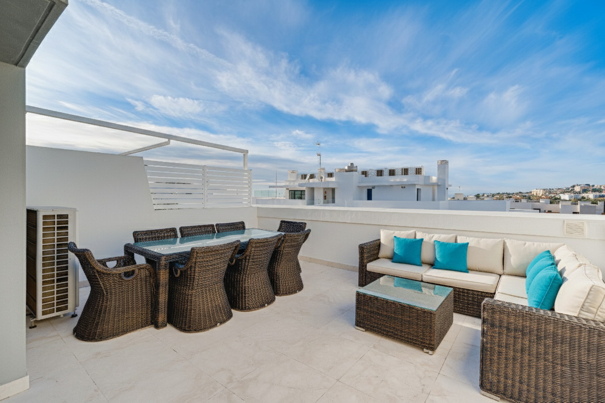 Exceptional four-bedroom townhouse located in an exclusive boutique development of just 48 contemporary luxury townhouses, set on an elevated plot in La Cala de Mijas. The gated community is surrounded by beautifully landscaped tropical gardens and offers three communal swimming pools. Ideally positioned within walking distance to the beach and the vibrant town centre of La Cala. The ground floor features a bright open-plan living and dining area with a modern fully fitted kitchen, opening onto a private garden with direct access to the communal pool, creating an ideal indoor–outdoor lifestyle. This level also includes a guest bedroom and a full bathroom. On the first floor, the property offers a spacious master suite with a private terrace, two additional guest bedrooms, and a stylish shared bathroom. The upper level leads to a generous private solarium, complete with a plunge pool, perfect for relaxing or entertaining. The lower level provides a large multipurpose room, ideal for a gym, home cinema, games room, or additional living space, along with a laundry room and direct internal access to the garage. Additional features include hot and cold air conditioning, two private parking spaces and concierge service. This property offers a perfect combination of contemporary design, comfort, and a prime coastal location with short term rentals allowed within the community.