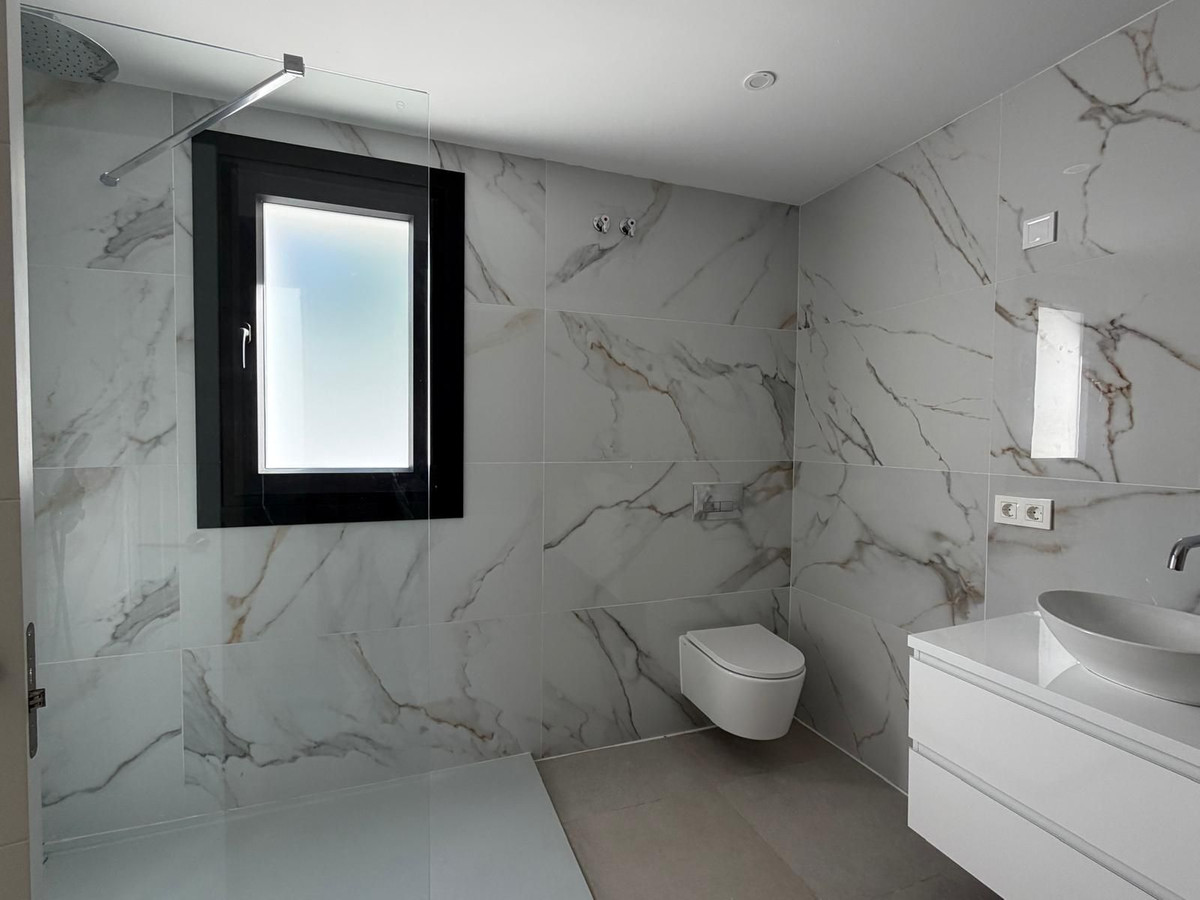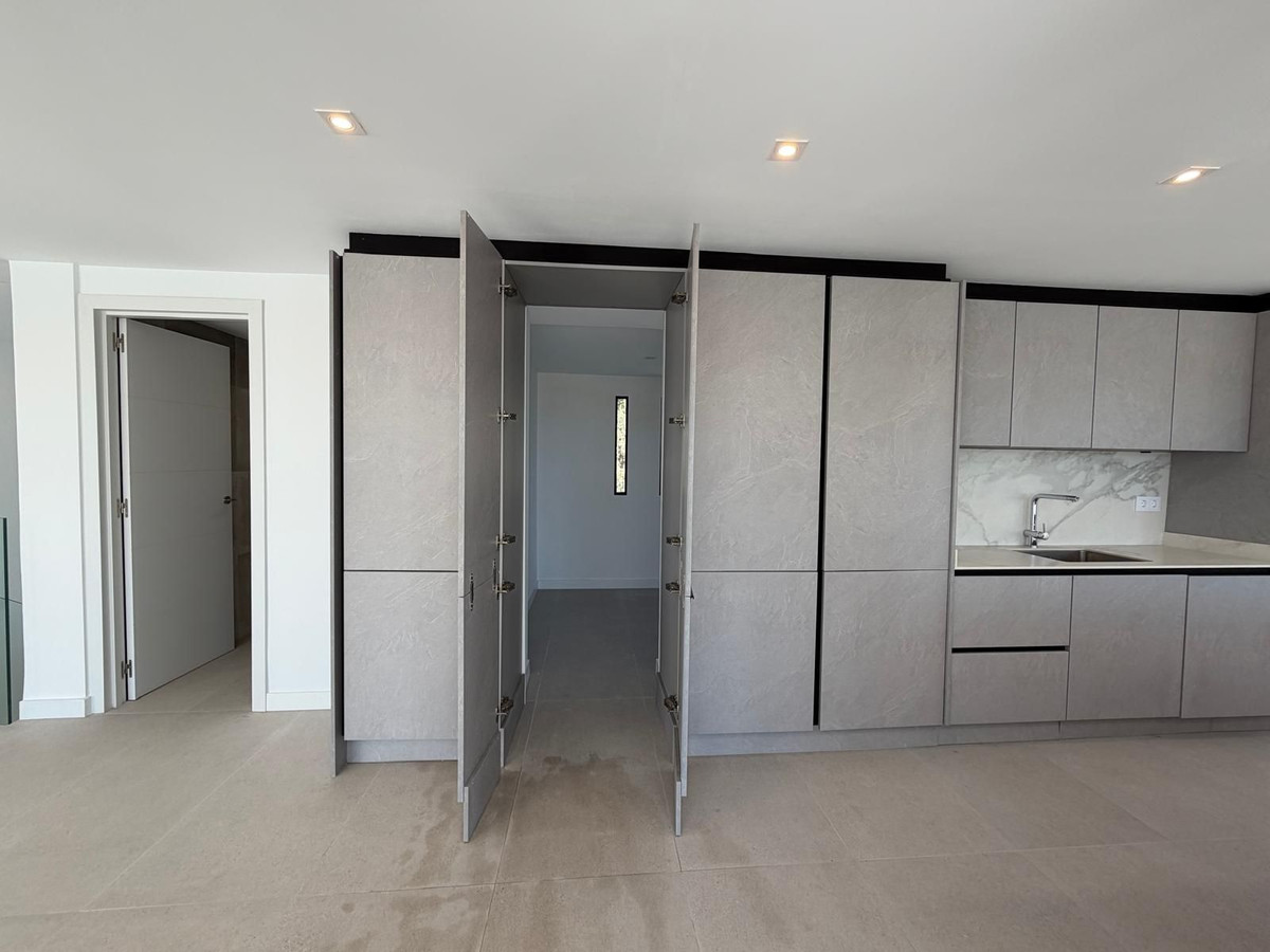 Filled with natural light, the villa boasts open-plan living areas with large windows and glass doors, seamlessly connecting indoor and outdoor spaces and enjoys open views with pleasant sea views. The modern open-plan kitchen features a large central island with an integrated cooking field, ideal for both everyday living and entertaining guests.