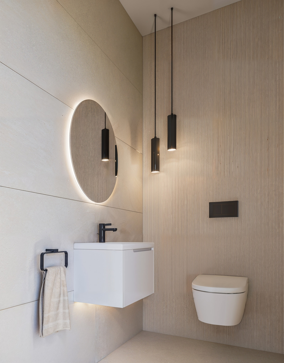 En-suite bathroom located in the secondary bedroom, designed with state-of-the-art fittings and are fined contemporary aesthetic. Full-height porcelain tiling from floor to wall and a minimalist shower area with floor-to-ceiling glass screen. Integrated countertop basin with a high-quality two-drawer vanity unit (available in a colour or wood-effect finish) and a backlit mirror that enhances both functionality and style.