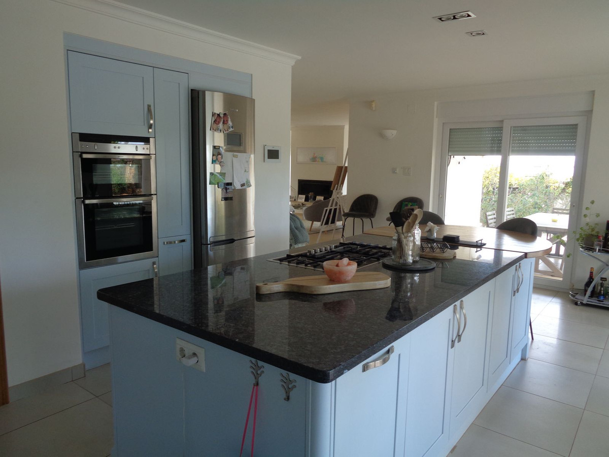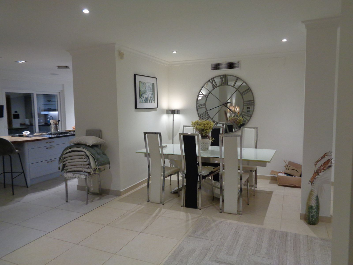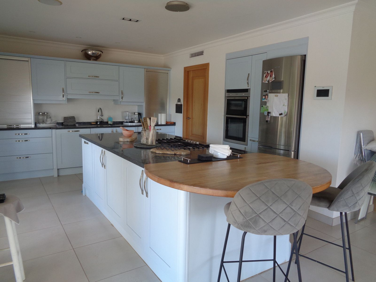 A beautiful dining area is between the lounge and the kitchen. Moving into the spacious kitchen which has a large centre island/breakfast bar with modern utilities and appliances. The kitchen is a very welcoming space which is also flooded with light having three sets of double patio doors leading out to the terraces, gardens and swimming pool.