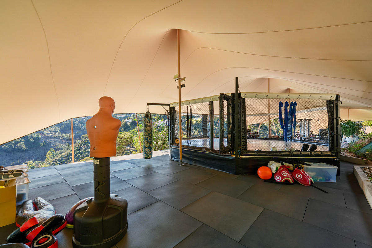 A five-bedroom villa in El Madroñal, Benahavís, offering five bathrooms plus a guest cloakroom, with a first floor dedicated to the master suite with dressing room and library alongside a guest ensuite, a ground floor arranged around formal and informal living areas, dining room, kitchen, wine cellar and guest suite opening onto terrace and a heated sea salt infinity pool, and a lower level with garage and home office. The property sits on an expansive plot with panoramic views and includes a fully equipped outdoor gym complete with professional apparatus and boxing ring. The architecture is partially integrated into the mountain itself, creating a naturally climate-controlled environment that works in tandem with underfloor heating throughout the house and a comprehensive smart home system managing comfort and security.