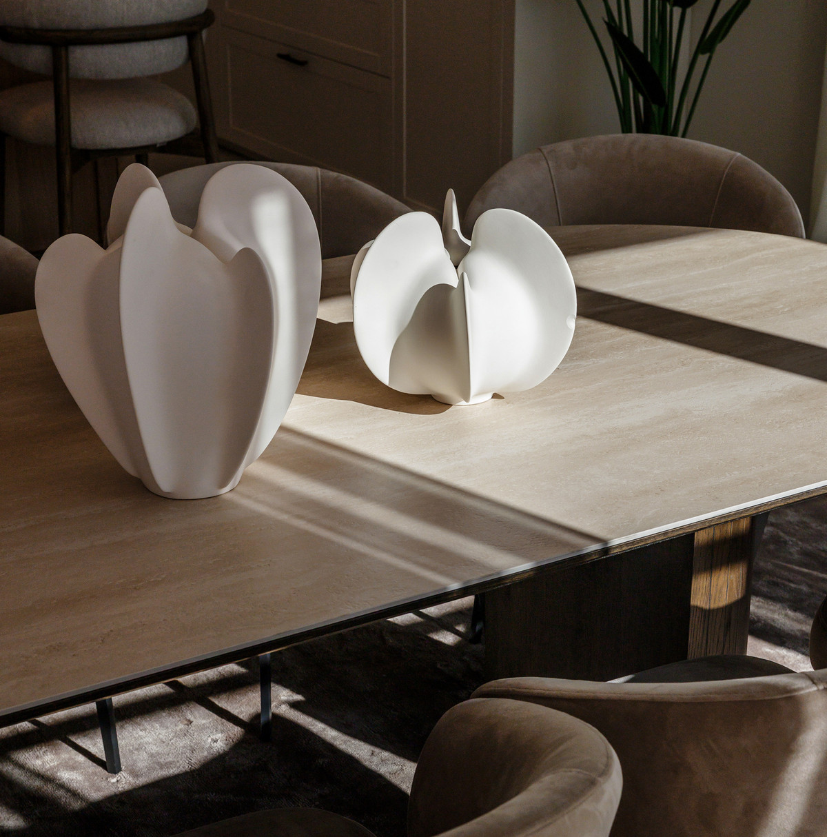 The kitchen is a key highlight of the property. Designed with clean lines and premium materials, it includes a large central island, built-in appliances, and abundant storage concealed within tailored cabinetry. The layout encourages interaction, with direct views toward the living room and seamless access to the exterior terraces and pool. This combination of layout and design makes the main floor one of the home’s strongest assets.