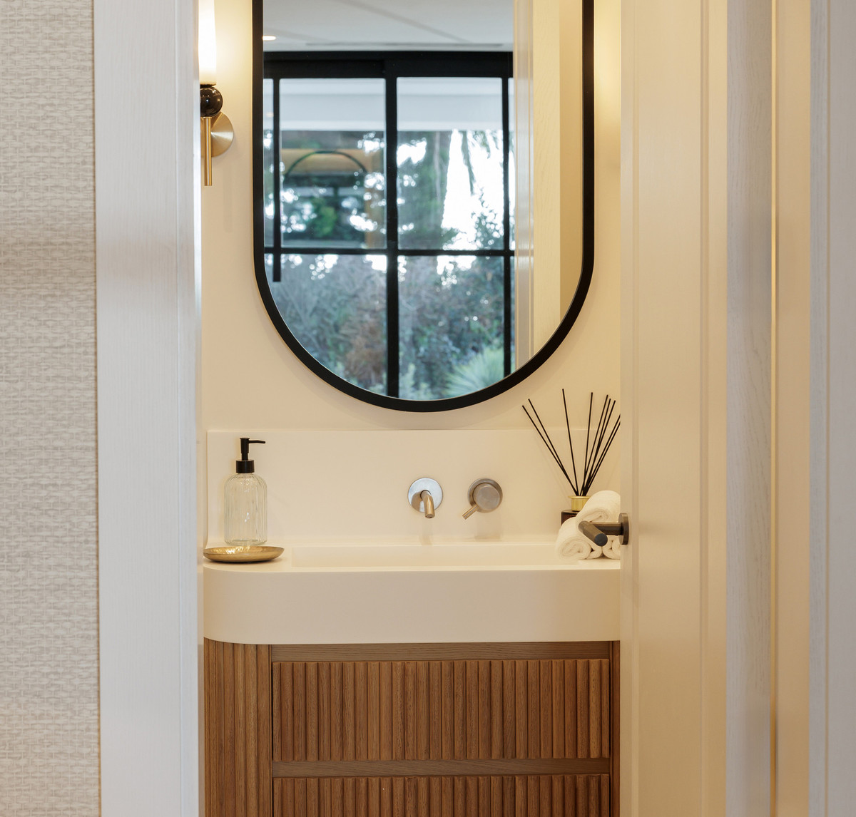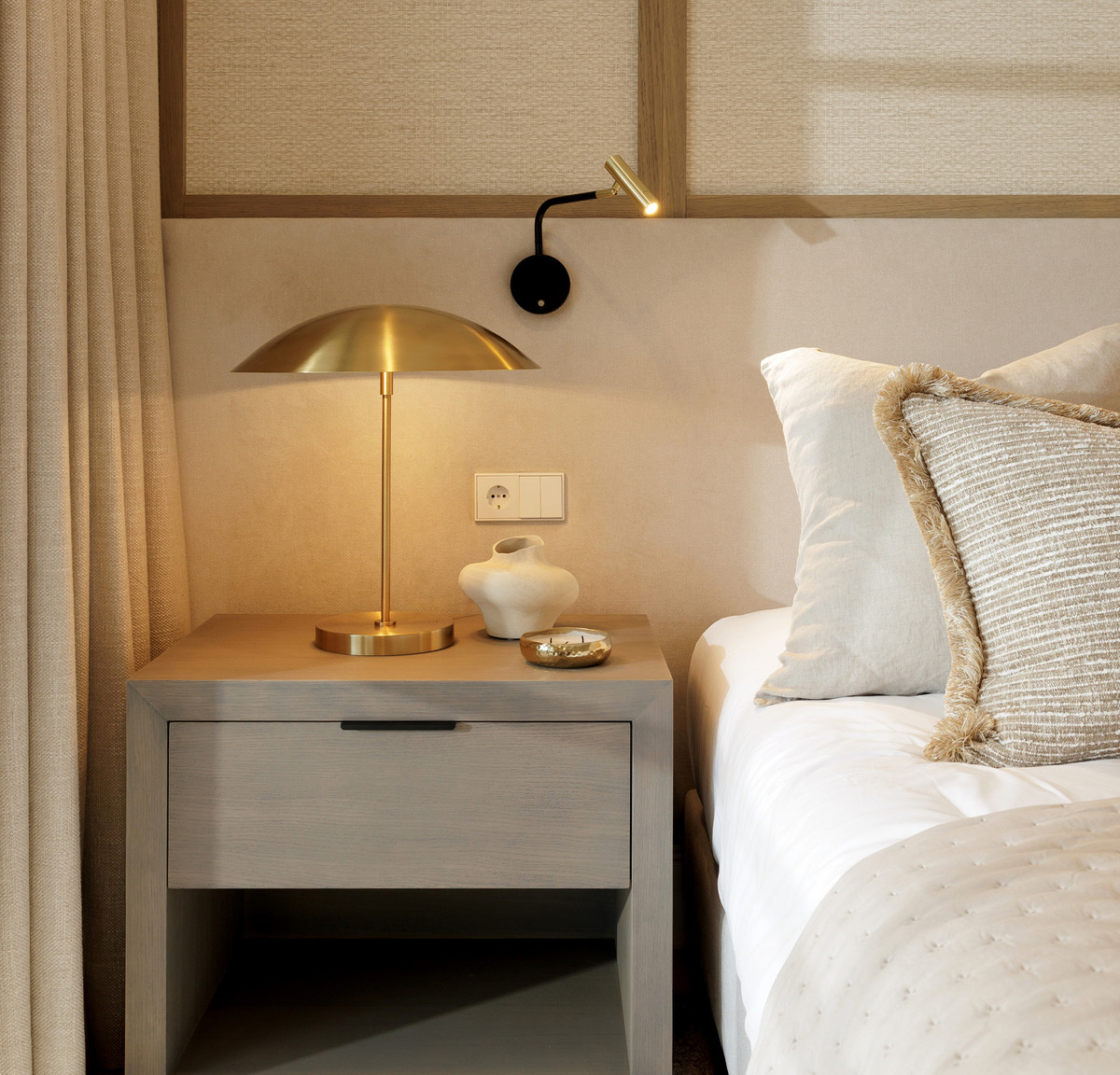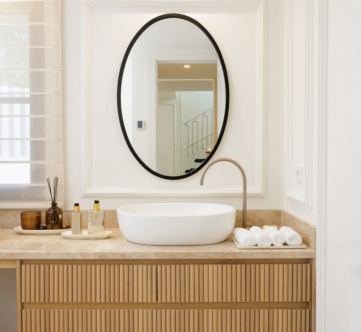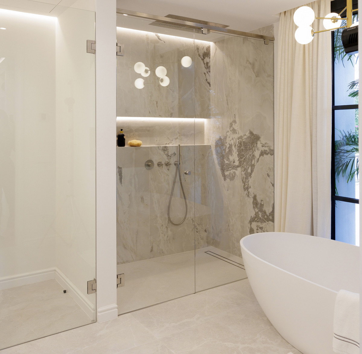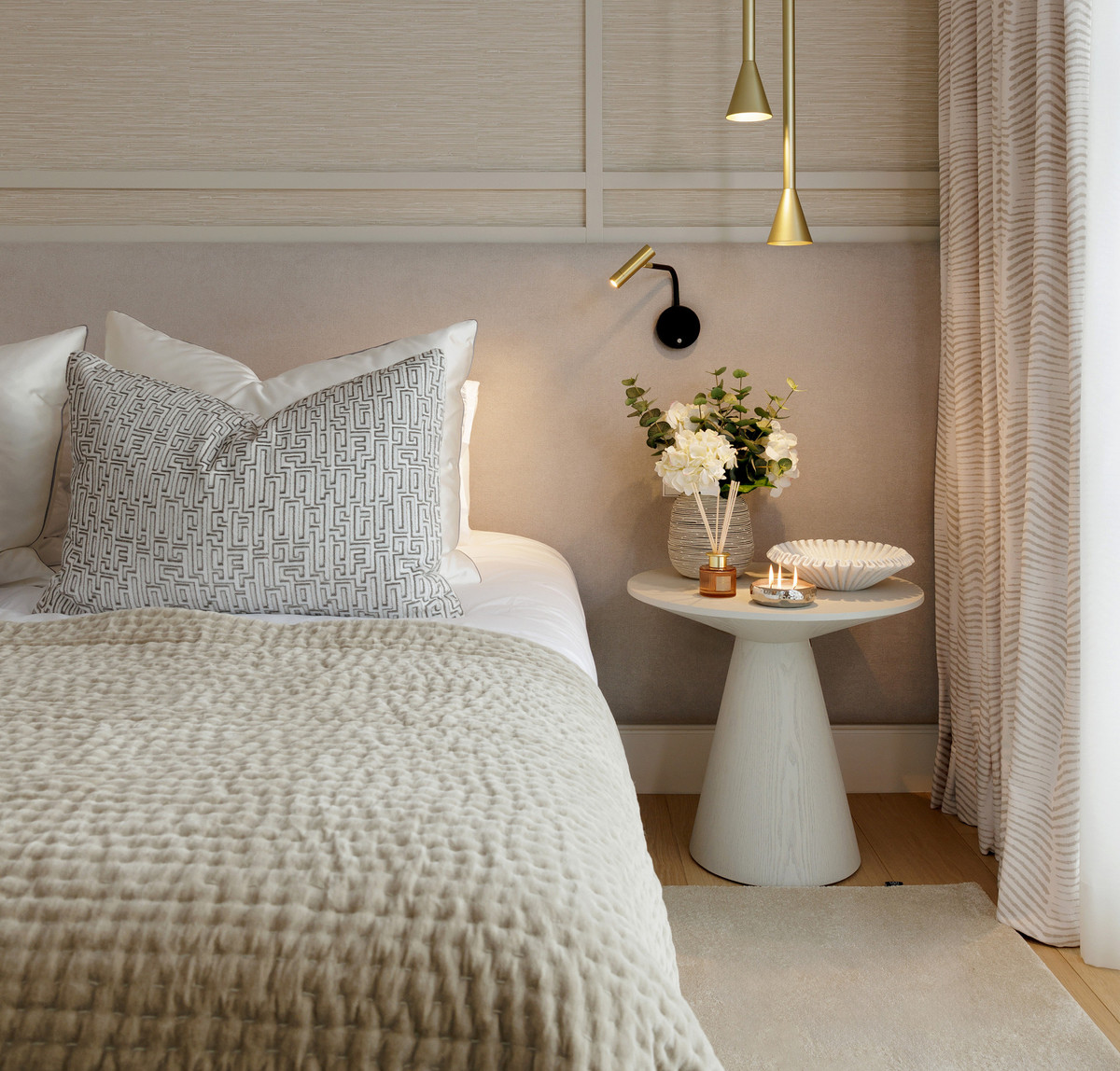 The property offers five well-appointed bedrooms, including a private primary suite on the upper floor with direct terrace access. Each room follows the same design standard—neutral tones, bespoke carpentry, and thoughtful lighting. The upper level also opens to extensive outdoor areas that capture views across the coastline.