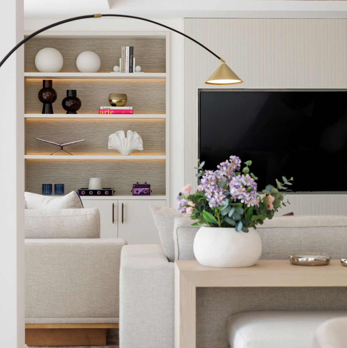 Villa Agata presents a modern Mediterranean home in La Quinta with incredible sea views. Set on a 1,109 m² plot and newly renovated throughout, the villa showcases striking architecture paired with refined interiors by Soledad Merchant. The main living area is a bright, open space with floor-to-ceiling glass, custom shelving, and a smooth transition to the outdoor areas. The adjacent dining zone and lounge are arranged for practical everyday use while still offering an elegant setting for hosting.