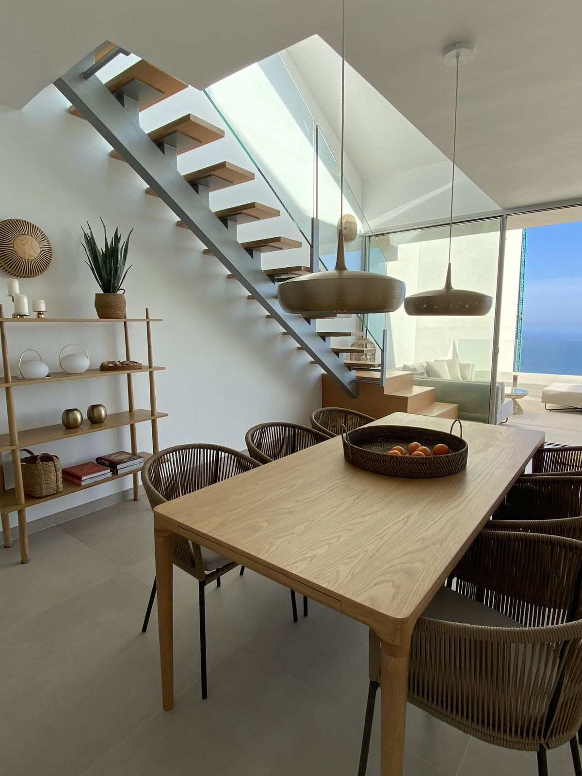 A striking modern staircase crafted from metal, wood, and glass leads to the upper floor, dedicated to the impressive master suite. Here you will find a spacious bedroom with direct access to a second private terrace boasting spectacular panoramic sea views. The master level also includes a walk-in wardrobe, a luxurious en-suite bathroom, and a practical laundry and drying area.