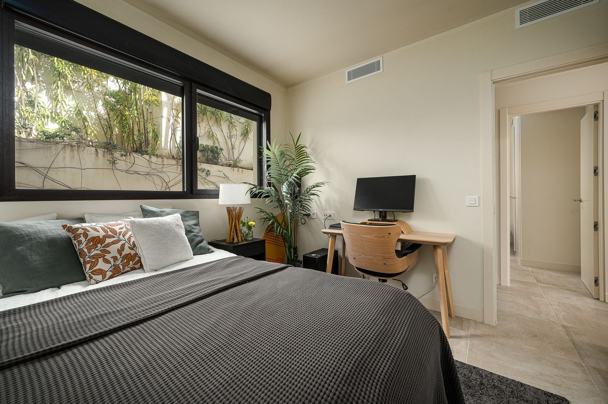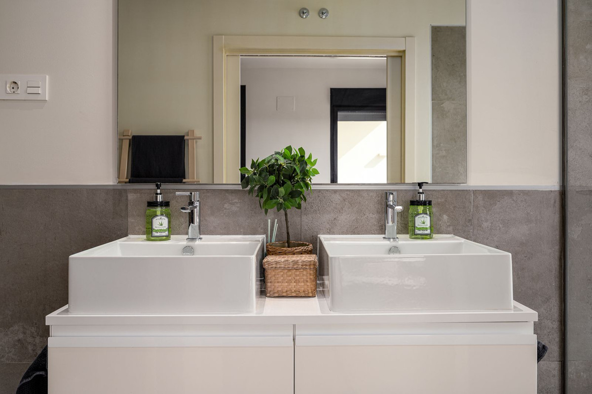 La chambre principale est un havre de calme et de raffinement, avec un dressing, une luxueuse salle de bains attenante dotée d'une double vasque, d'une baignoire et d'une douche à l'italienne, ainsi qu'un accès direct à une terrasse privée conçue pour des matins sereins sous le soleil espagnol.