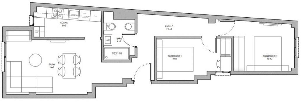 La propriété dispose d'une surface habitable de 77 m², fonctionnellement répartie en 2 chambres, 1 salle de bain complète, un salon-salle à manger lumineux, un couloir et une cuisine entièrement meublée et équipée avec des appareils électroménagers.