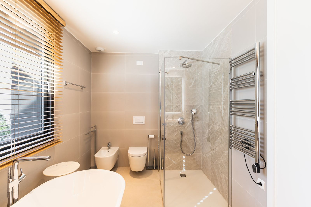 La villa propose quatre chambres spacieuses et quatre salles de bains modernes, alliant confort et fonctionnalité. Lumineuses et vastes, les chambres sont dotées de nombreux placards, offrant un espace idéal pour la détente et le quotidien en famille. La suite parentale, ainsi que l'une des chambres d'amis au premier étage, bénéficient d'une terrasse privative avec vue panoramique sur la montagne, le golf et la mer Méditerranée.