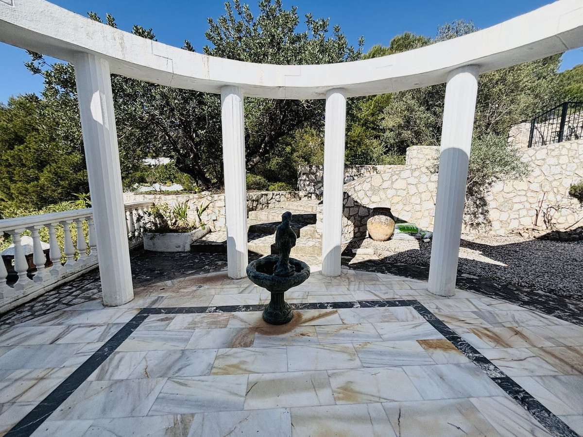 Les espaces extérieurs sont tout aussi impressionnants, avec un accès direct depuis la terrasse par des escaliers extérieurs descendant vers une grande piscine entourée d'un jardin magnifiquement entretenu et planté d'oliviers centenaires. Le cadre est véritablement exceptionnel, offrant une vue imprenable et un environnement idéal pour profiter du plein air et recevoir. De plus, la propriété comprend un appartement d'invités entièrement indépendant avec sa propre entrée privée.